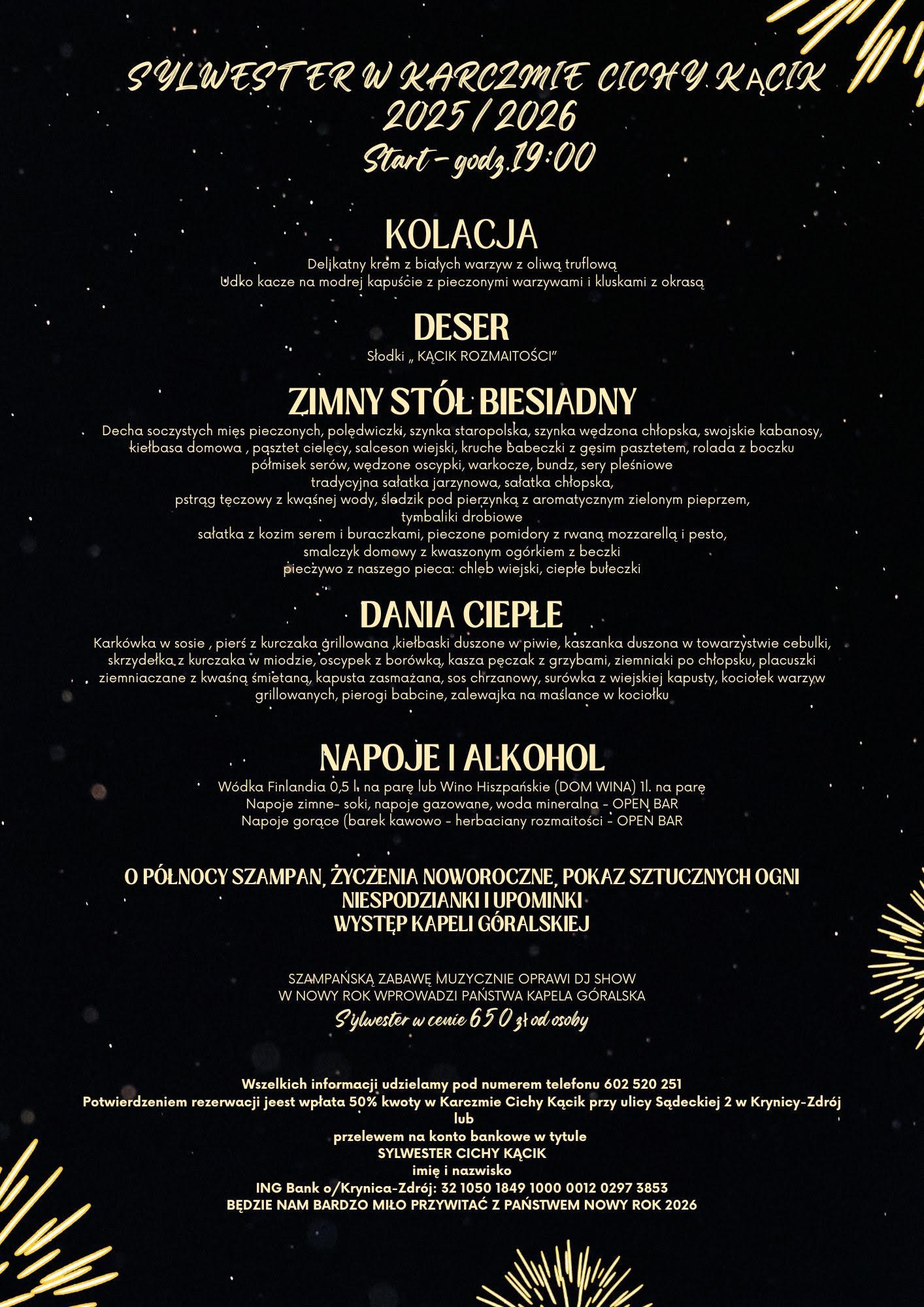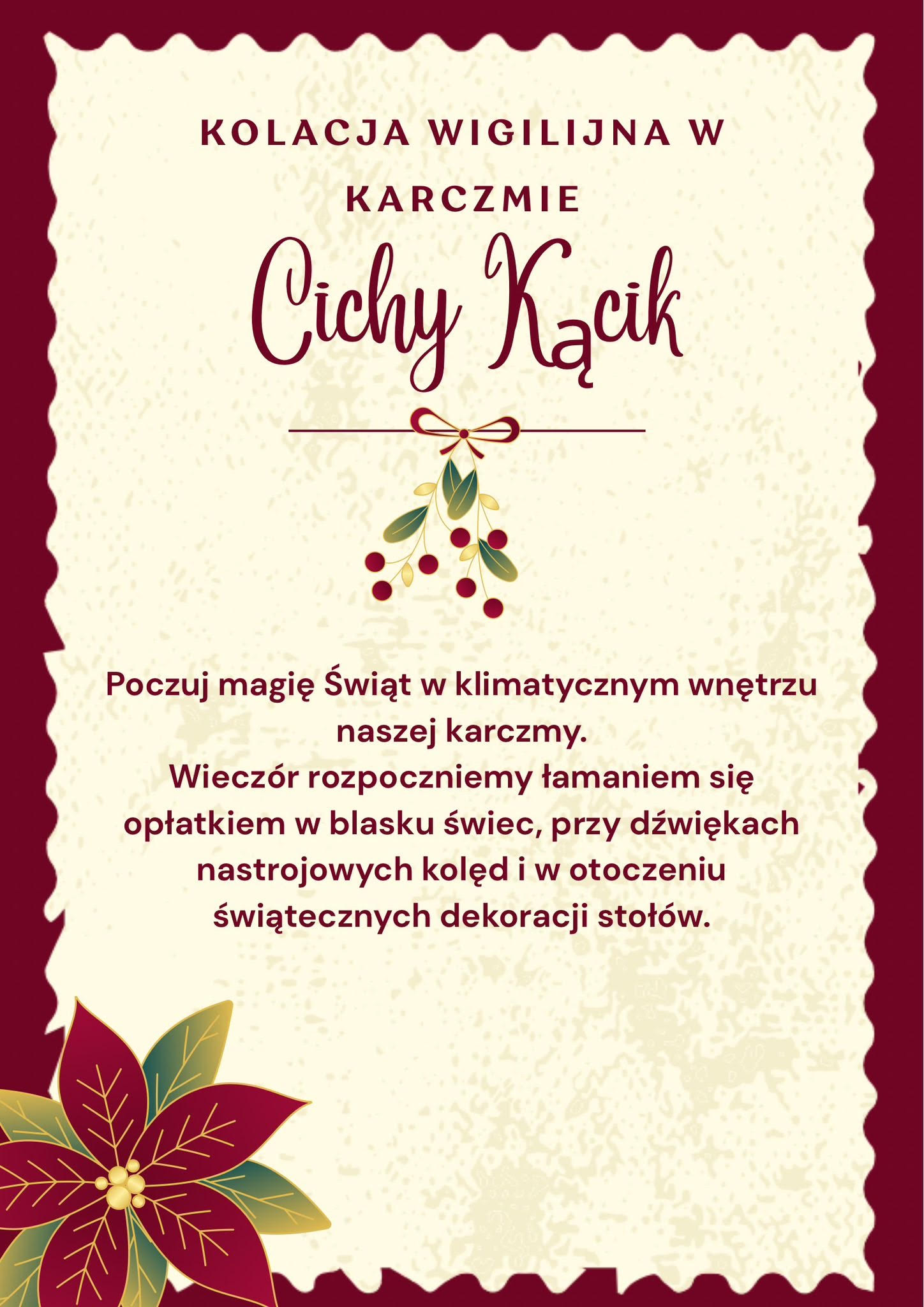 Karczma Cichy Kącik to urocze miejsce z historią i tradycją istniejące od 1936 roku, by z MIŁOŚCI DO KUCHNI I TRADYCJI dać kolejnym pokoleniom możliwość skosztowania wspaniałej kuchni opartej na tradycyjnych domowych recepturach.